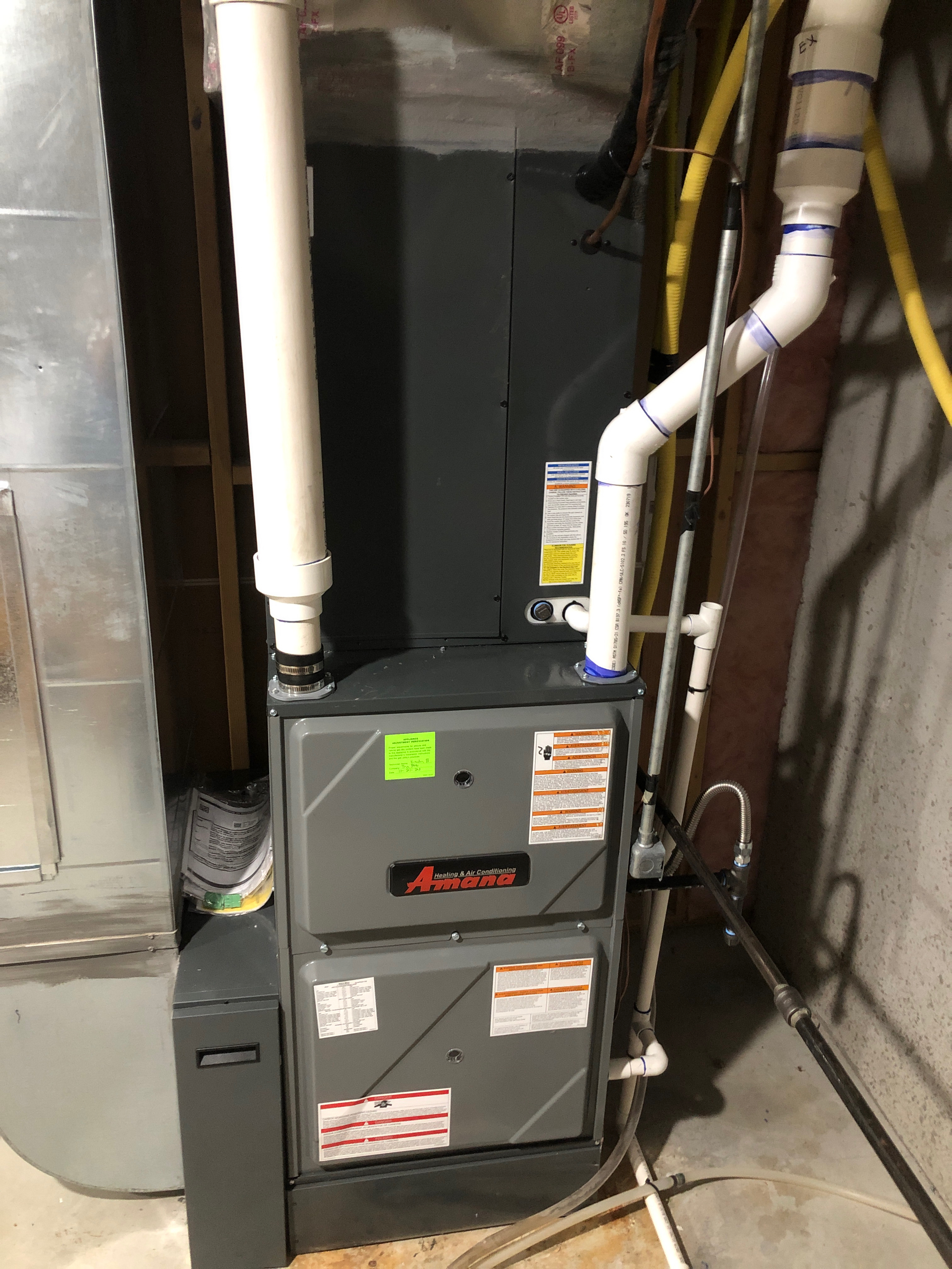 High efficiency: High efficiency furnaces run like the low efficiency but with extra steps. After the burning gas flows through your heat exchanger, it is rerouted through a secondary heat exchanger, transferring even more heat into your ductwork, before entering the exhaust pipe. This exhaust pipe will be a plastic PVC pipe which will stay much cooler than a low efficiency exhaust and will be capable of handling the water which will be forming inside the exhaust as a biproduct of combustion. High efficiency furnaces also must have a drain for running in heating mode, and a place to drain which will not freeze. Typically on this furnace 90-97% of the heat is transferred to your ductwork and the rest is wasted as hot exhaust gas, which equals energy savings. Upgrading a low efficiency furnace to a high will include more labor in order to install the correct intake, exhaust, and drain pipes.
